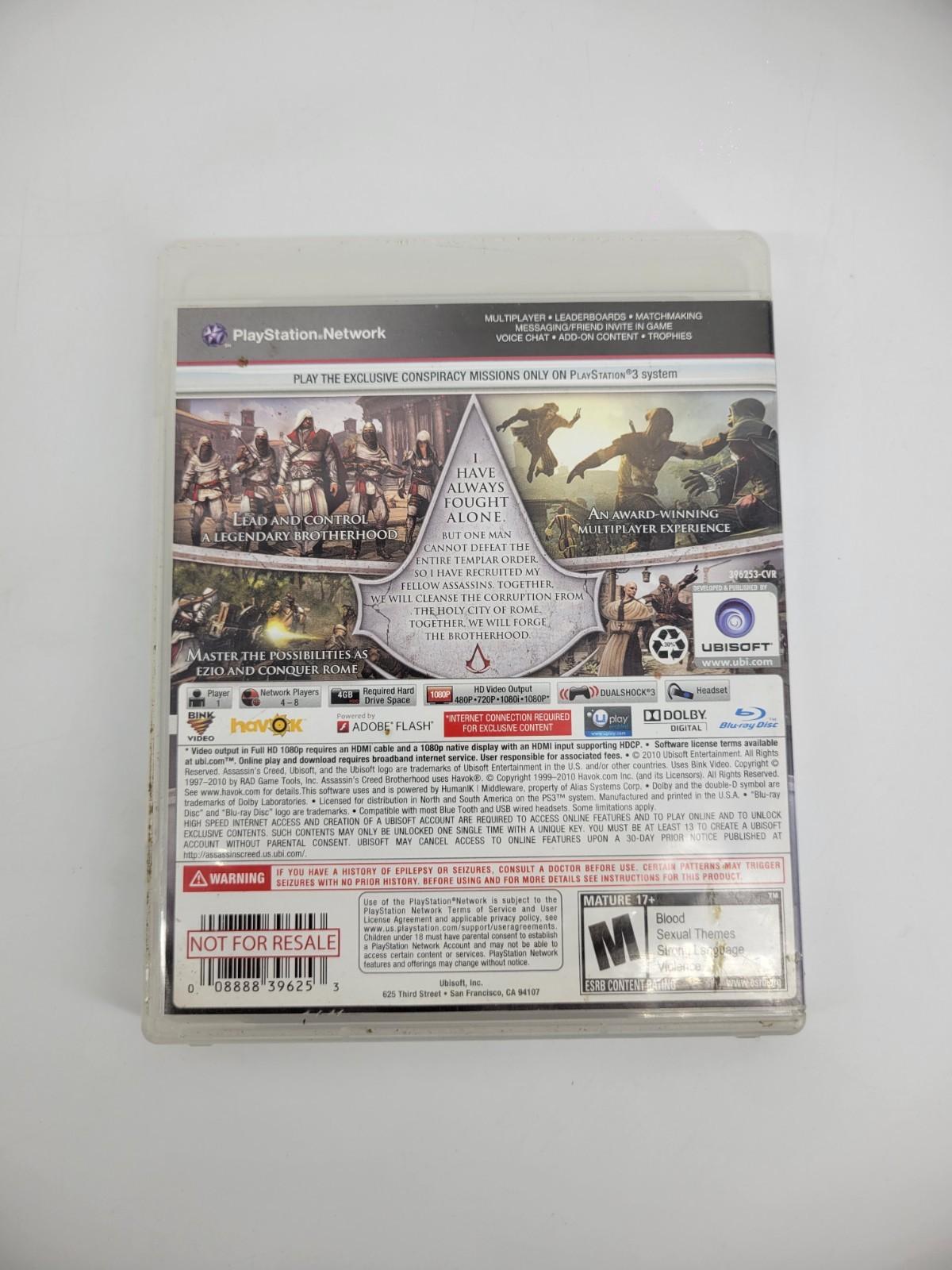 Assassin's Creed Brotherhood for Sony PlayStation 3 is a complete video game that has been tested and is in working condition. Released in 2010 by Ubisoft, this action-adventure game is part of the popular Assassin's Creed series. With a mature rating and a focus on stealth gameplay, this NTSC-U/C (US/Canada) region game includes the manual and offers hours of immersive gaming experience for fans of the genre.