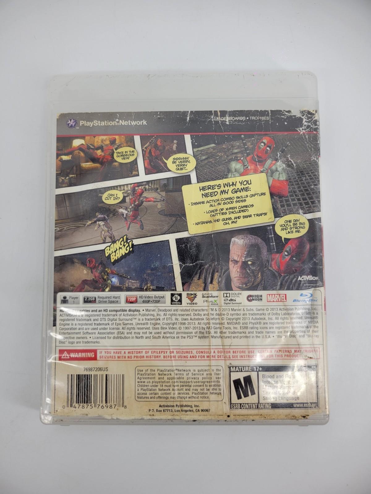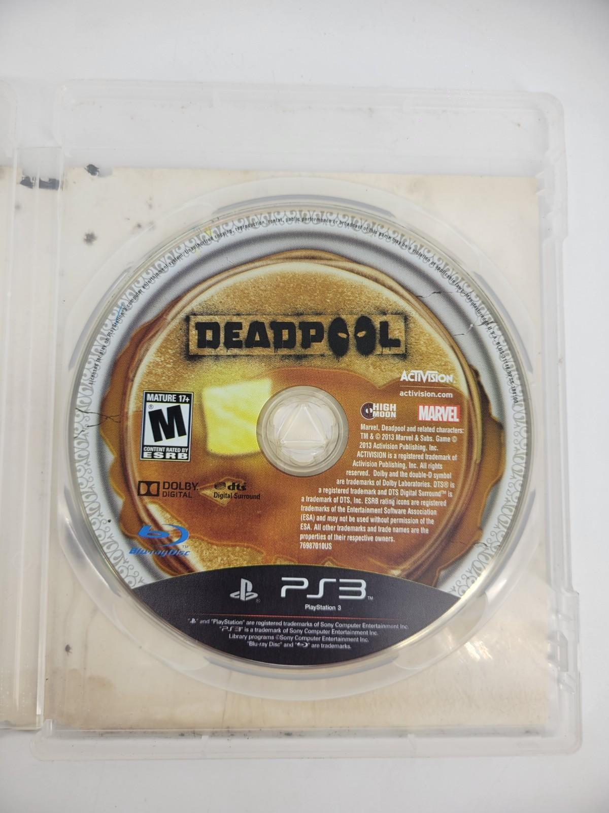 The product is a used, tested copy of the video game "Deadpool" for the Sony PlayStation 3, released in 2013. This action-adventure game is part of the Deadpool video game series and is published by Activision. With a Mature rating, players can expect a thrilling gaming experience as they take on the role of the popular anti-hero Deadpool in various intense missions. The disc and case are included, providing fans with a chance to enjoy this exciting game on their PS3 console.