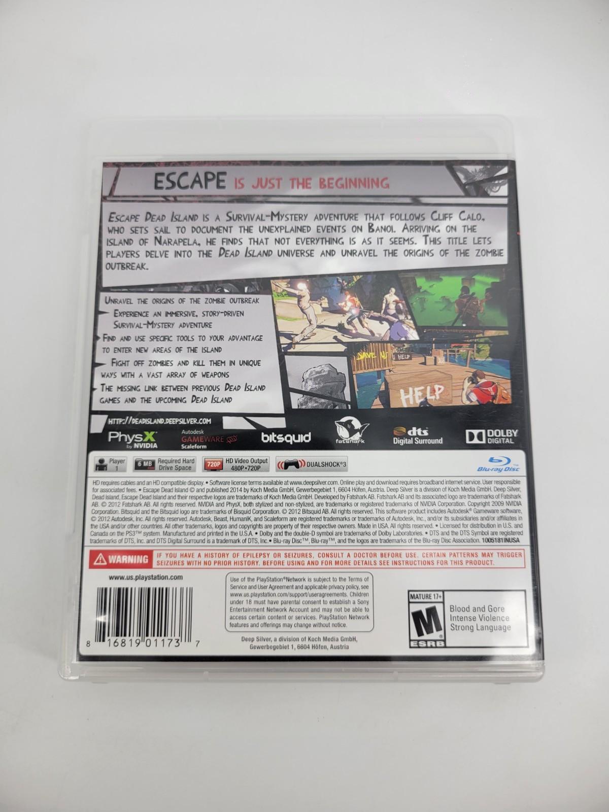 The product is a complete used Sony PlayStation 3 game titled "Escape Dead Island" from the Dead Island Series. Released in 2014, the action and adventure game is rated M for Mature audiences. The game includes the manual and is published by Sony. With a focus on fast-paced gameplay and zombies, this NTSC-U/C (US/Canada) region game offers a thrilling experience for fans of the series on the PlayStation platform.