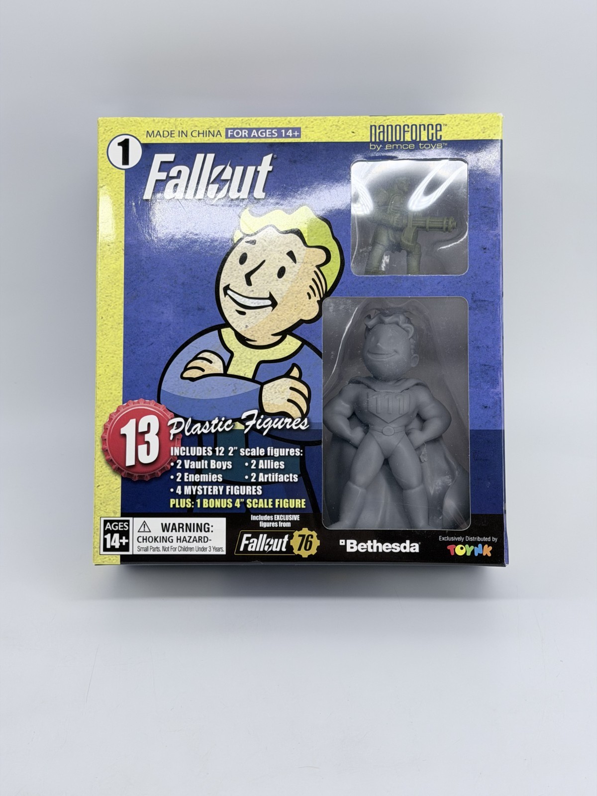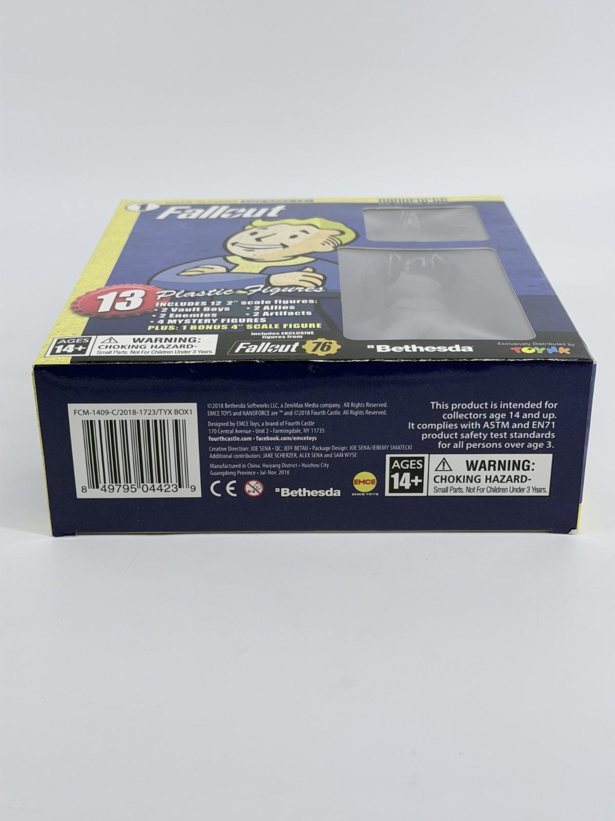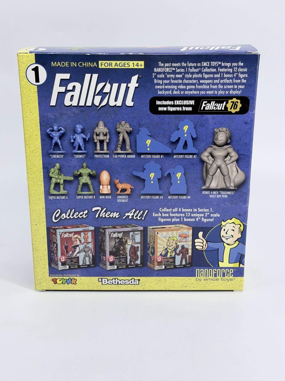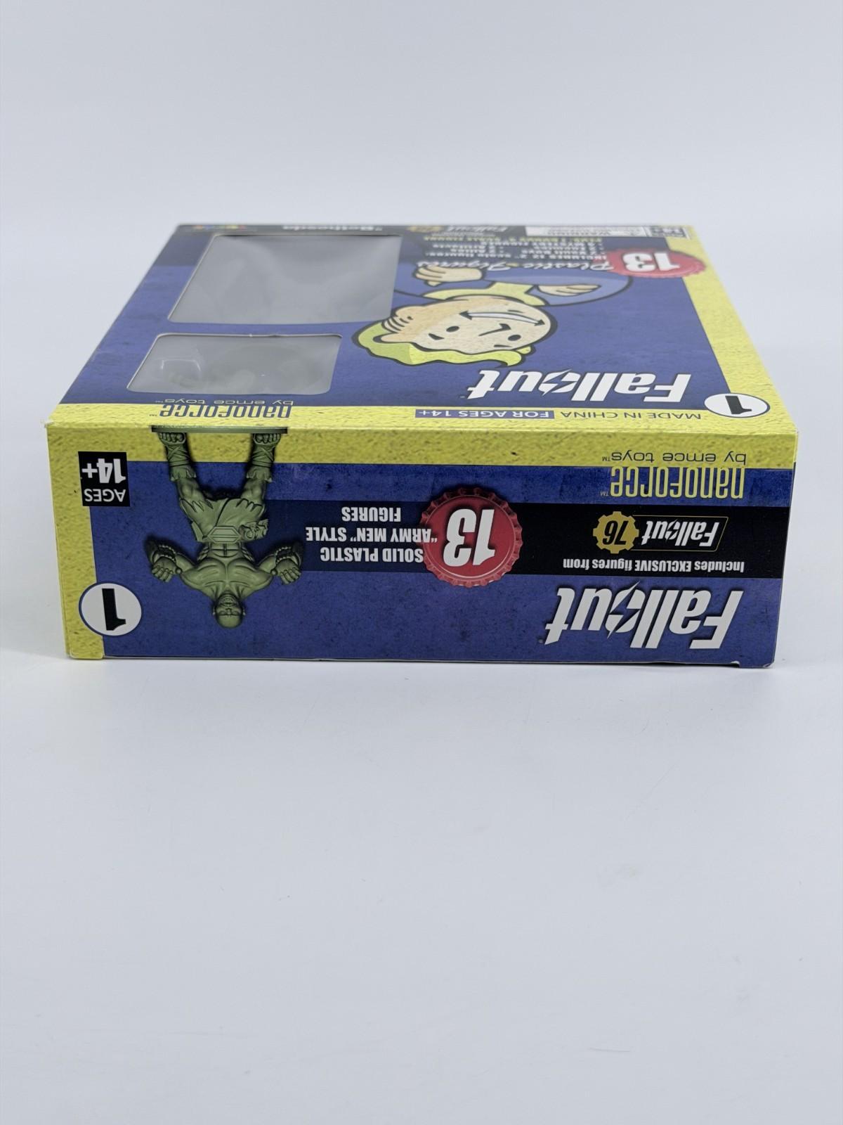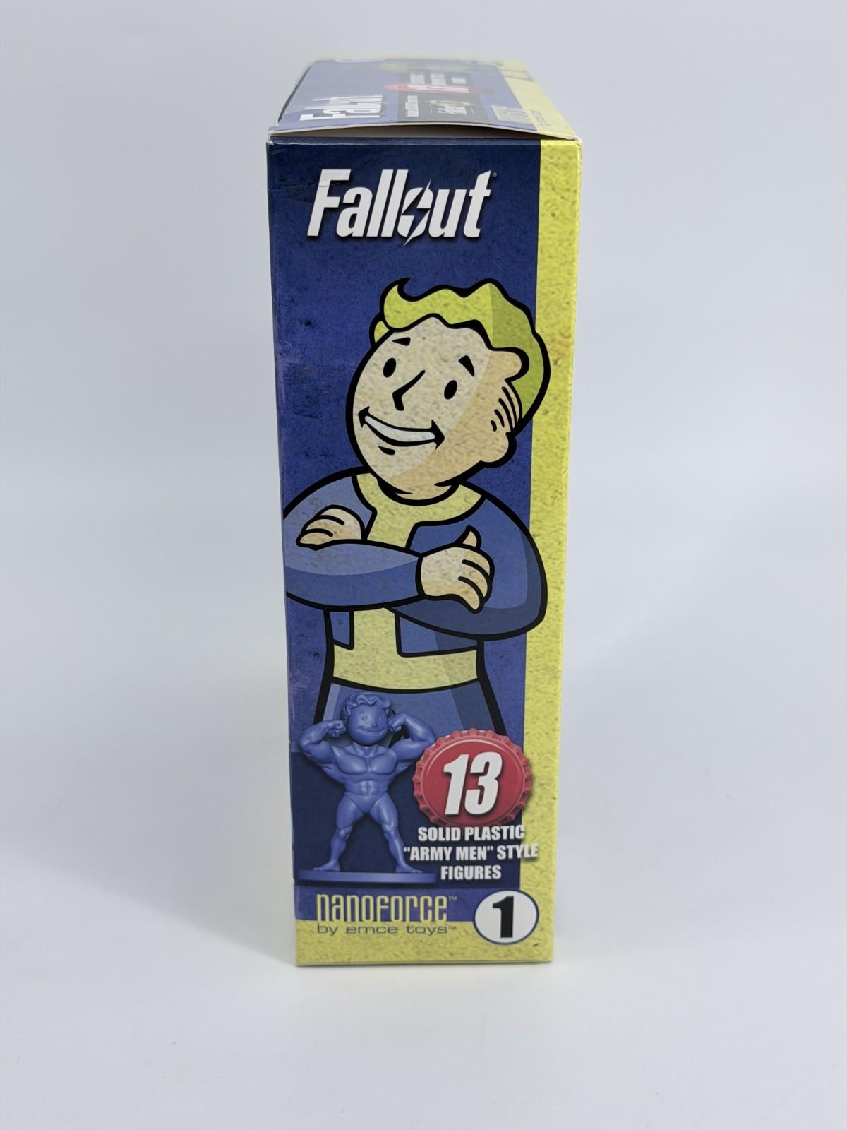 The Fallout Nanoforce Series 1 Army Builder set includes 13 plastic figures featuring characters from the popular video game franchise. Produced by Emce Toys, these figures are new and sealed, making them ideal for collectors and fans of Fallout. The figures showcase characters from the game, including Vault Boy, and are perfect for enhancing any action figure collection with a touch of the post-apocalyptic world of Fallout.