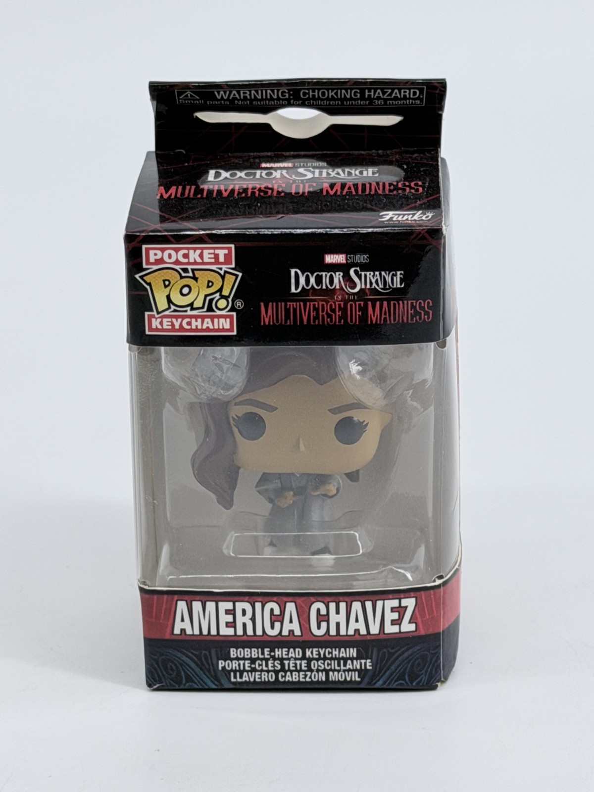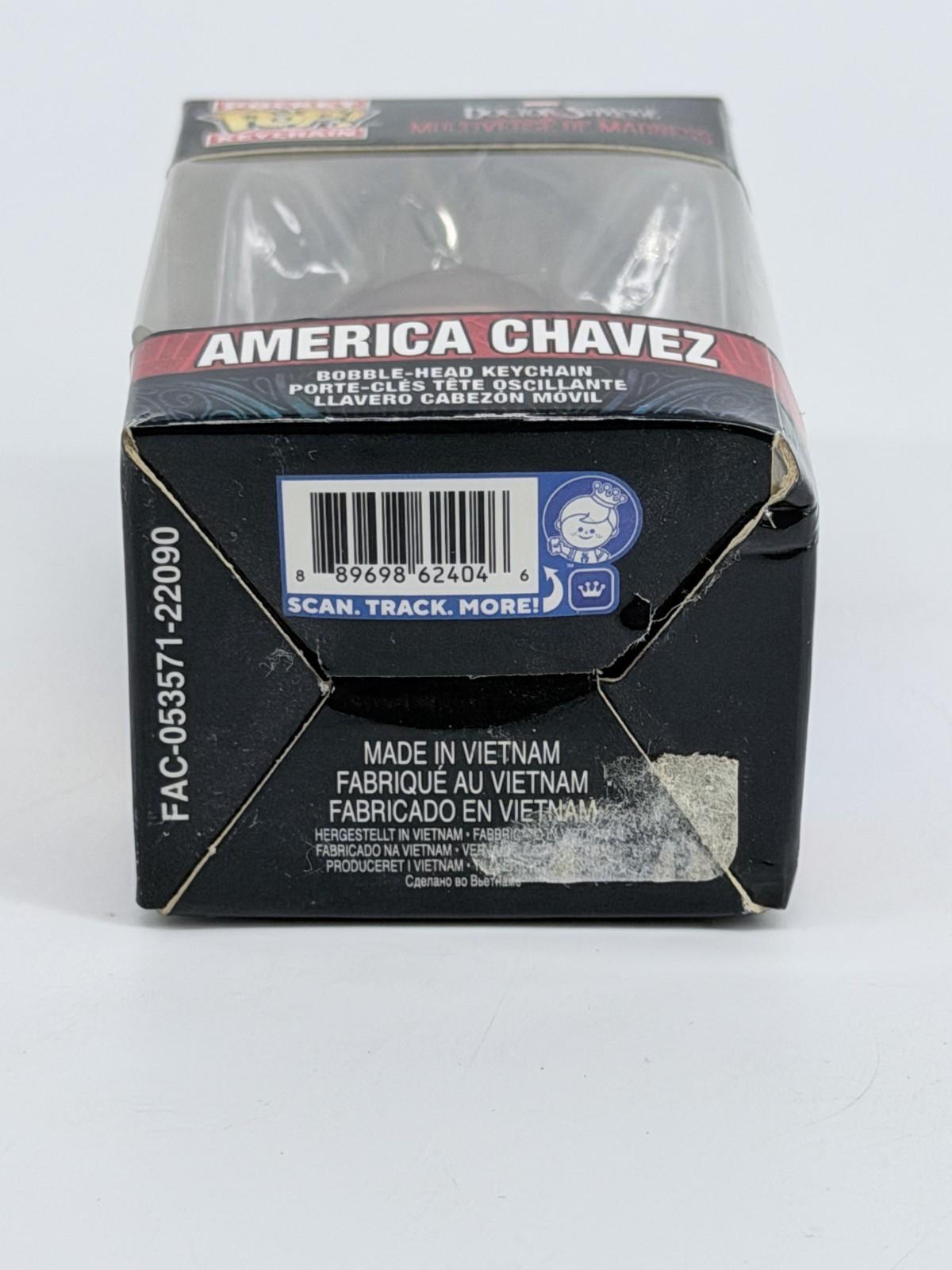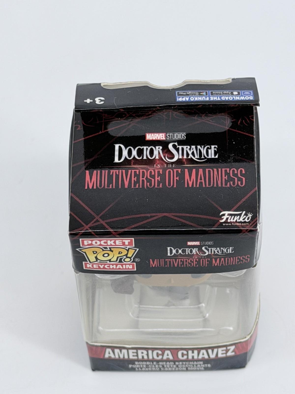 The Funko Pop! Keychain Marvel Doctor Strange - America Chavez is a mini vinyl figure featuring the character America Chavez from the Marvel Universe. This collectible item is part of the Pop! Vinyl product line by Funko and comes in its original packaging, making it a perfect addition to any Marvel fan's collection. The figure is designed in vibrant colors and is a fun way to carry the character around with you as a keychain.