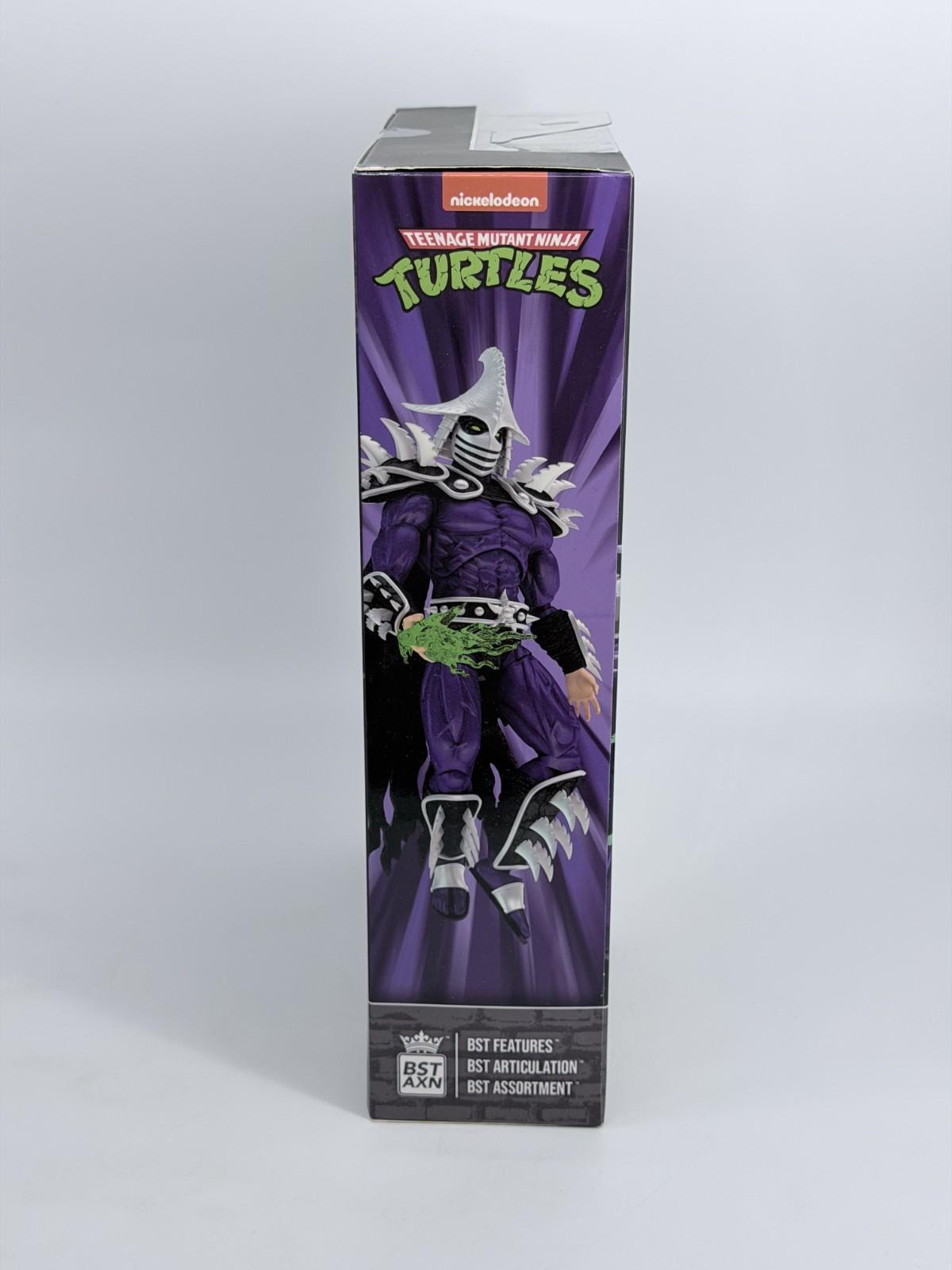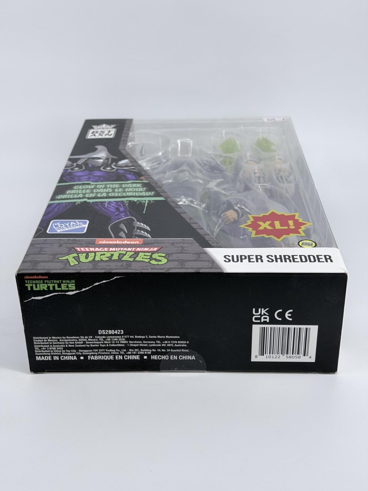 The Glow-In-The-Dark Super Shredder XL Figure is a limited edition collectible toy released by The Loyal Subjects for San Diego Comic Con in 2023. This exclusive action figure features the iconic character Shredder from the Teenage Mutant Ninja Turtles TV show and movies, with a unique design inspired by Nickelodeon Animation Studio. Made of ABS plastic and plastic, this multicolored figure glows in the dark and comes in its original packaging, perfect for fans of the TMNT franchise and collectors of action figures.