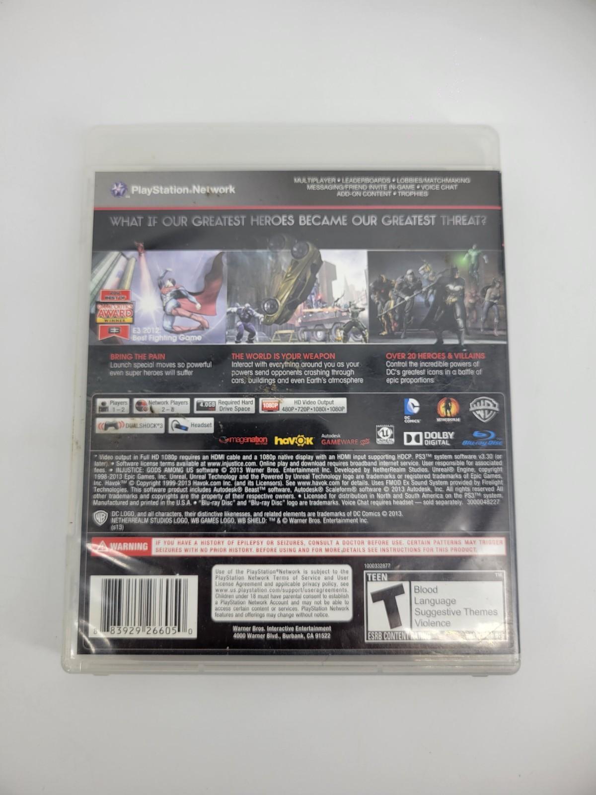 The product is a complete used copy of the video game "Injustice: Gods Among Us" for Sony PlayStation 3 (PS3). Released in 2013, the game falls under the fighting genre and is rated T for Teen. Published by Warner Bros., it includes the game manual and is compatible with NTSC-U/C (US/Canada) region codes. With tested gameplay and a trusted seller, this product offers an immersive experience for fans of the Injustice universe.