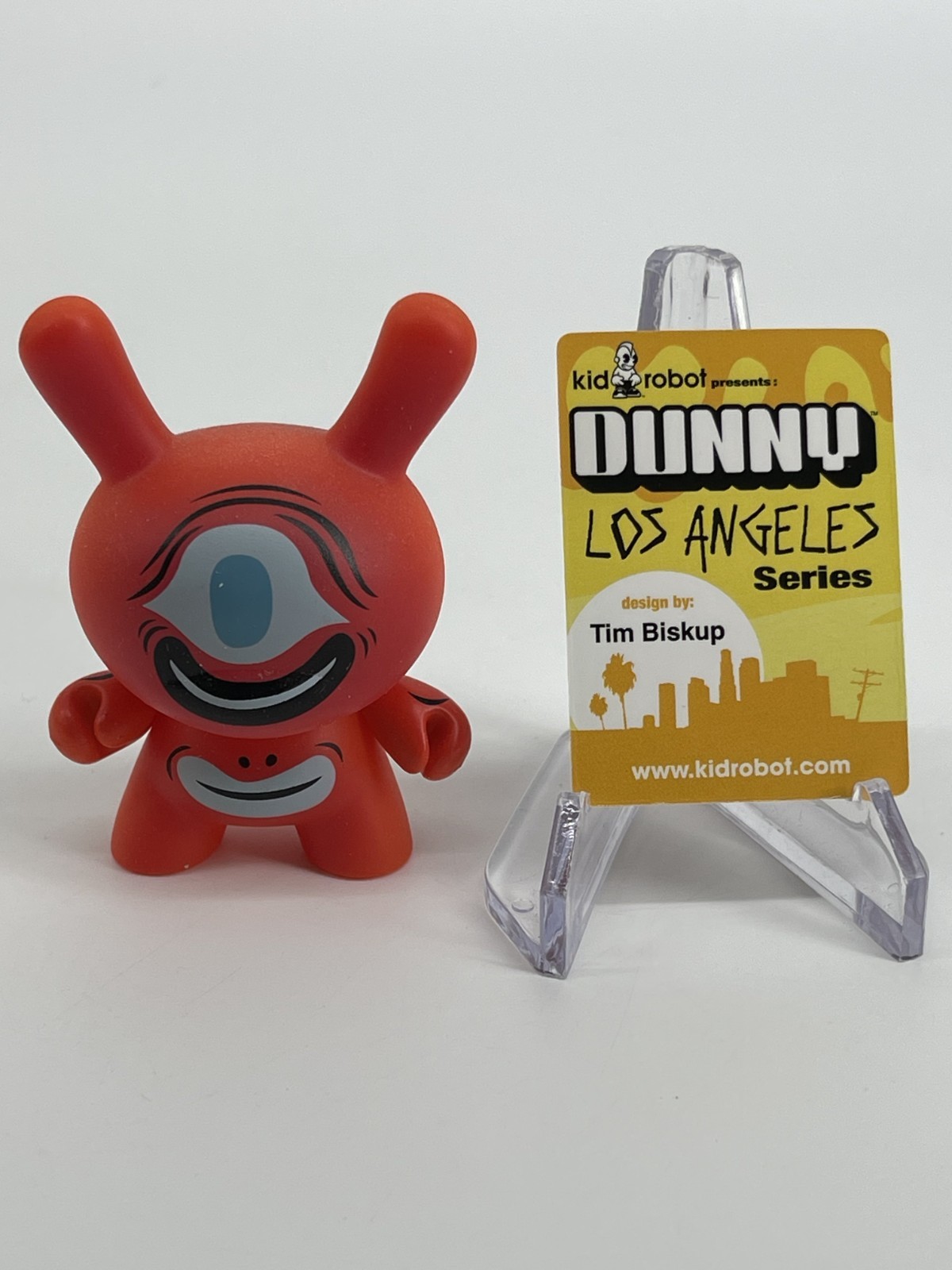 The Kidrobot Dunny Los Angeles Tim Biskup Designer 3" inch figure is a collectible action figure featuring a unique design by renowned artist Tim Biskup. This figure is part of the Dunny character family and showcases an urban vinyl theme, making it a sought-after item for toy collectors and fans of designer toys. The original packaging adds to the appeal of this limited edition piece, making it a valuable addition to any action figure collection.