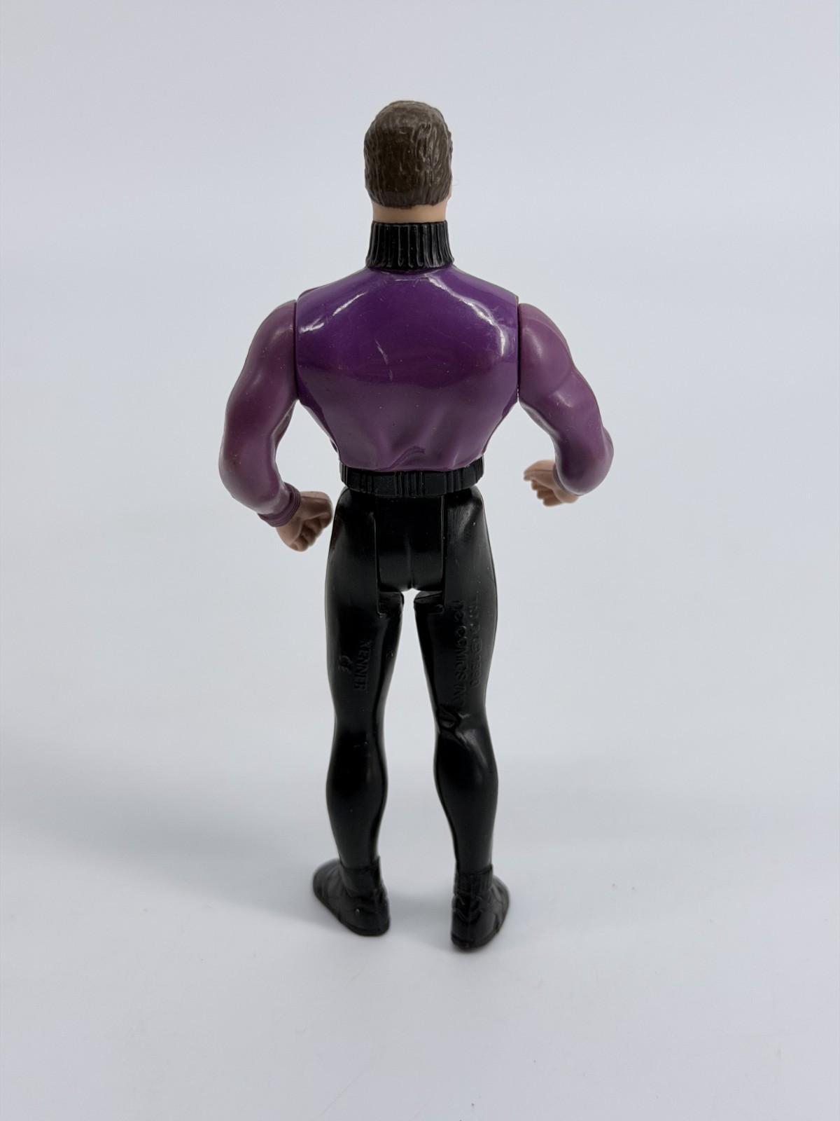 The Vintage 1990 Kenner Batman DC Comics Bruce Wayne Figure in the Purple Suit is a collectible action figure based on the character Bruce Wayne from the Batman franchise. Manufactured by Kenner in 1990, this plastic figure stands at 5 inches tall and is an original licensed reproduction. It is a must-have for collectors of vintage Batman memorabilia from the 1990s, especially those who appreciate the iconic purple suit worn by Bruce Wayne in the animated series produced by Warner Bros. Animation.