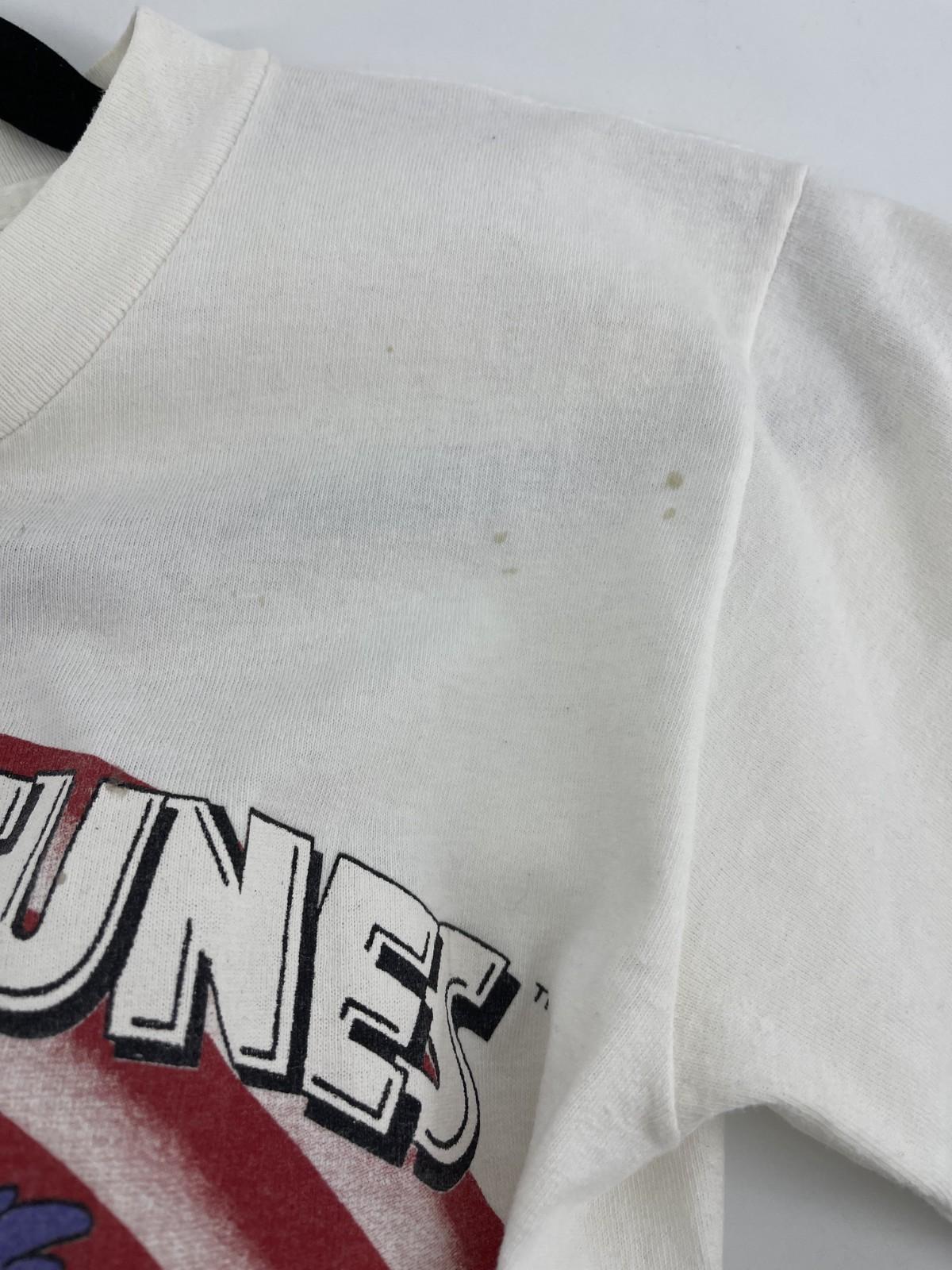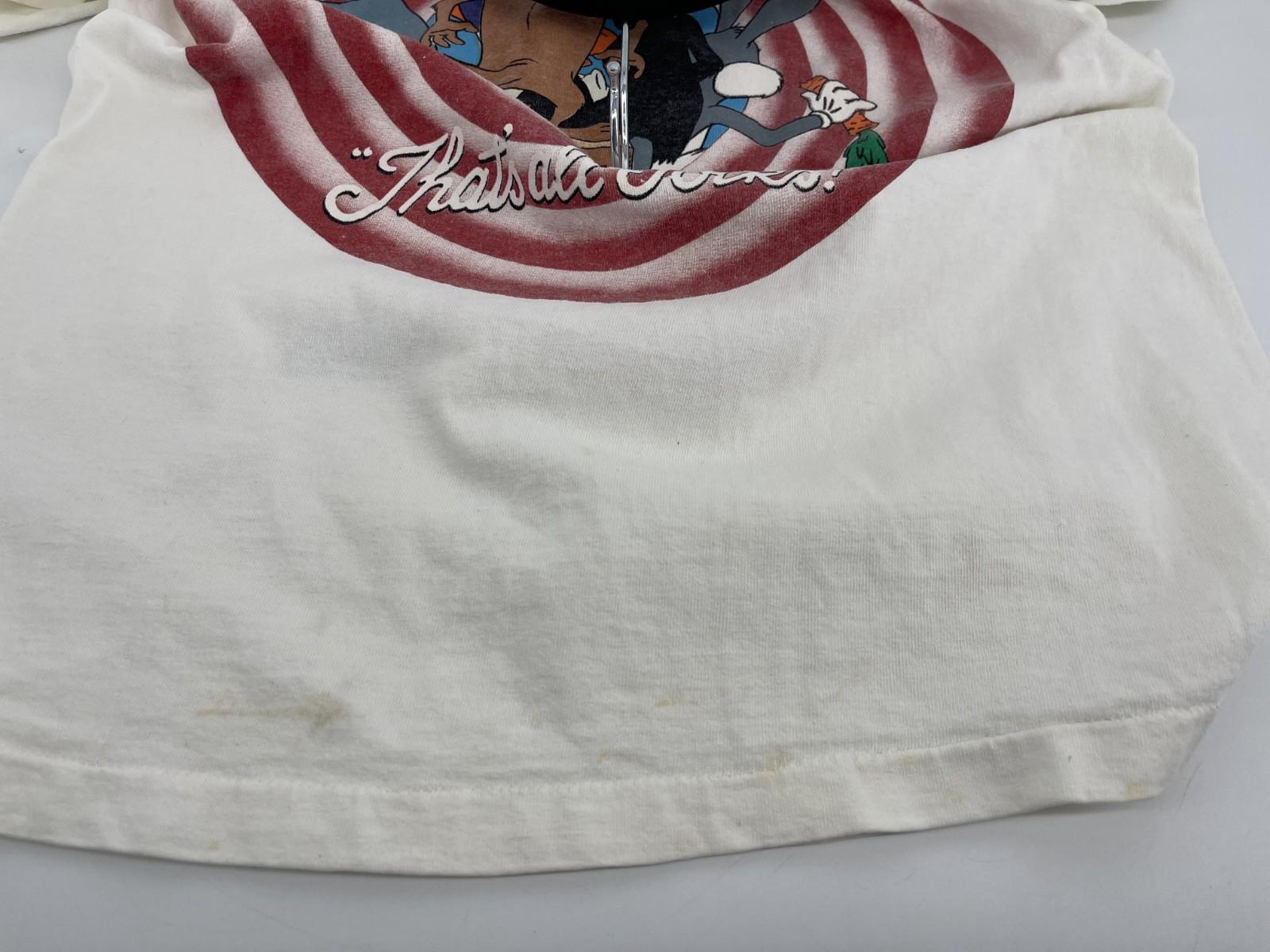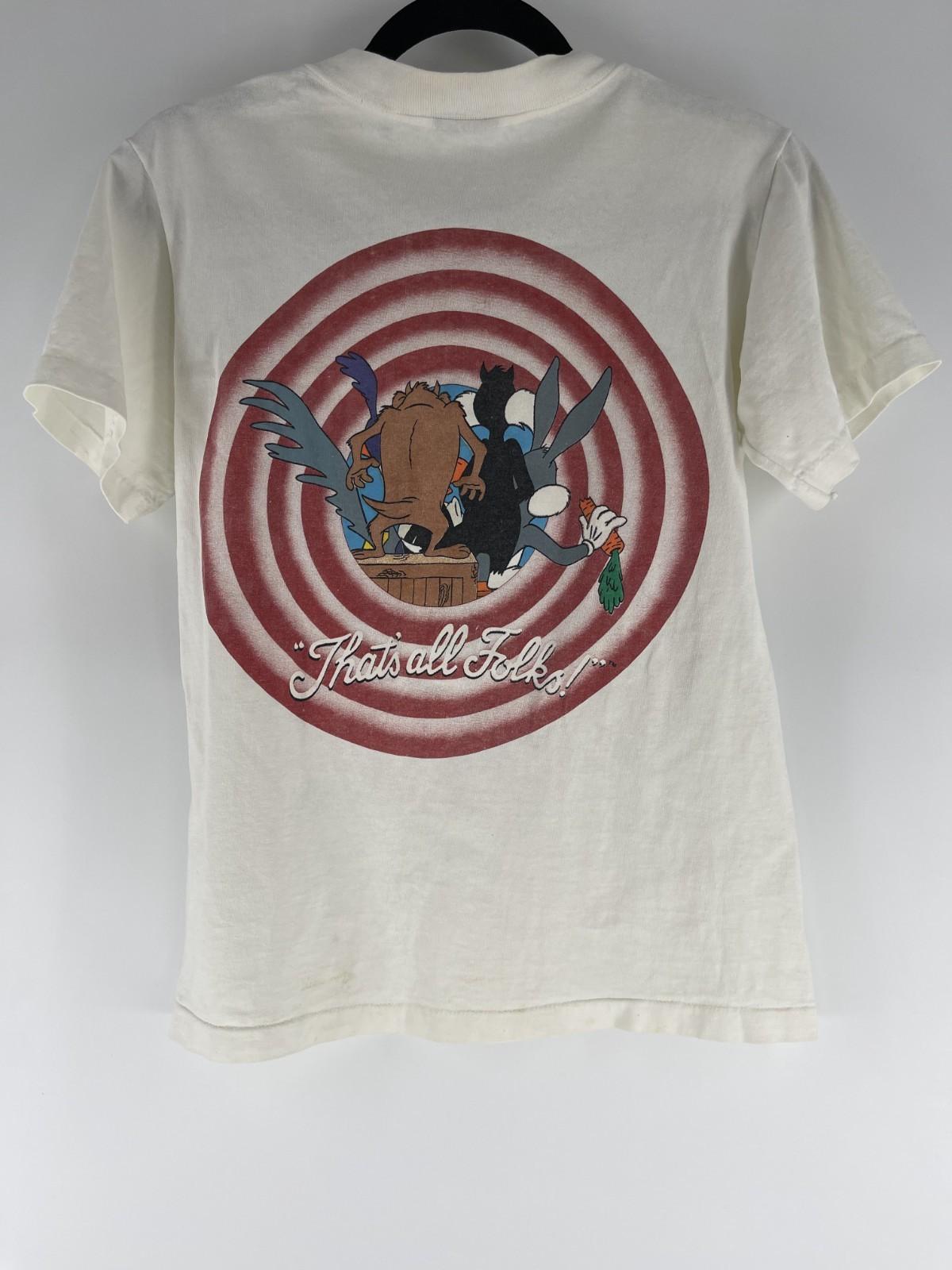 This Vintage Looney Tunes Shirt is a nostalgic graphic tee featuring Bugs Bunny from the iconic Looney Tunes series. The shirt is a classic white color with a crew neck and short sleeves, made from comfortable cotton material. With a regular fit and size small, this shirt is perfect for all seasons and is machine washable for easy care. Whether you're a fan of vintage clothing or just appreciate a good graphic tee, this shirt is a timeless piece that showcases a piece of American entertainment history.