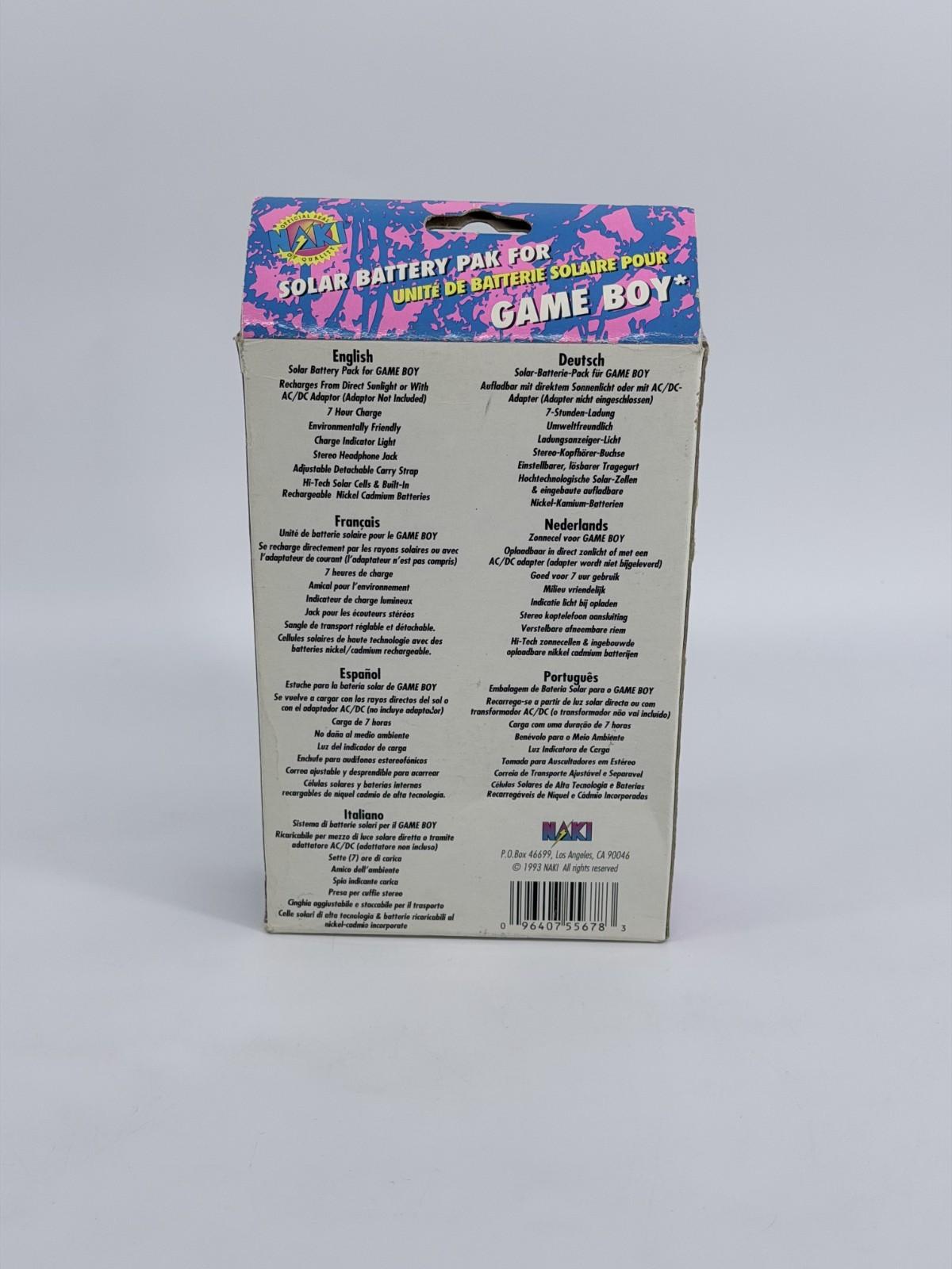 The Vintage Naki Solar Pak is a power supply unit designed specifically for the Nintendo Game Boy handheld console. This solar charger allows users to recharge their Game Boy batteries using sunlight, making it a sustainable and eco-friendly power solution for gaming on-the-go. The Naki brand ensures quality and reliability, while the included manual provides instructions for optimal use. This rare find comes in its original box, adding a nostalgic touch to any retro gaming collection.